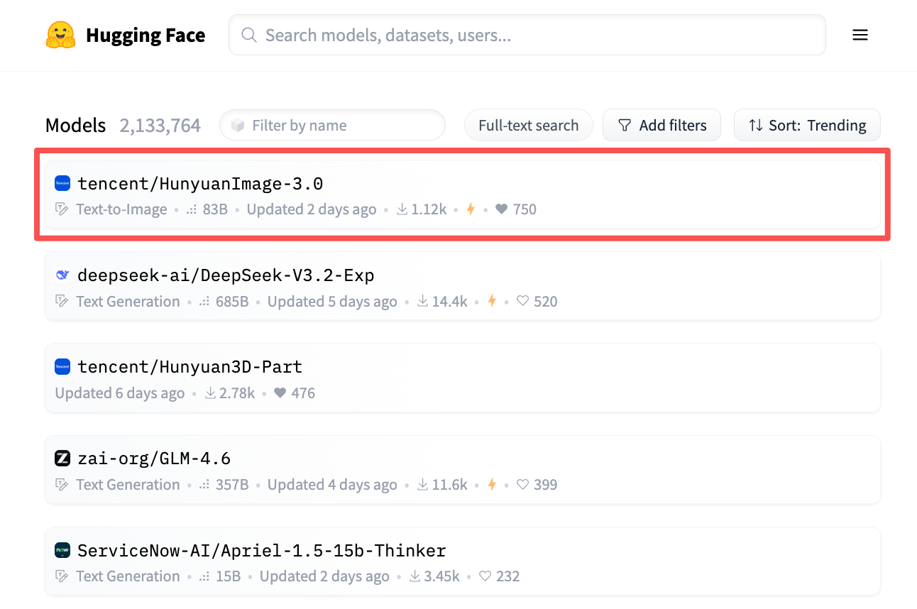 混元图像3.0模型也同样受到开发者的欢迎,发布后不久即登上了Hugging Face开源社区模型热榜的第一名,持续一周稳居第一;如今又登上了LMarena榜单的榜首,反映了用户与社区对模型的关注与认可。