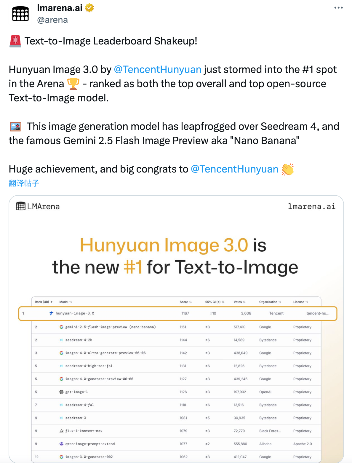 LMArena官方社交平台也第一时间发文祝贺:“文生图排行榜大洗牌!腾讯混元图像3.0登顶竞技场——同时被评为最佳综合文生图模型与最佳开源文生图模型。这款图像生成模型已超越Seedream 4,以及代号"nano-banana"的Gemini 2.5 Flash Image Preview。重大突破,恭喜腾讯混元。”
