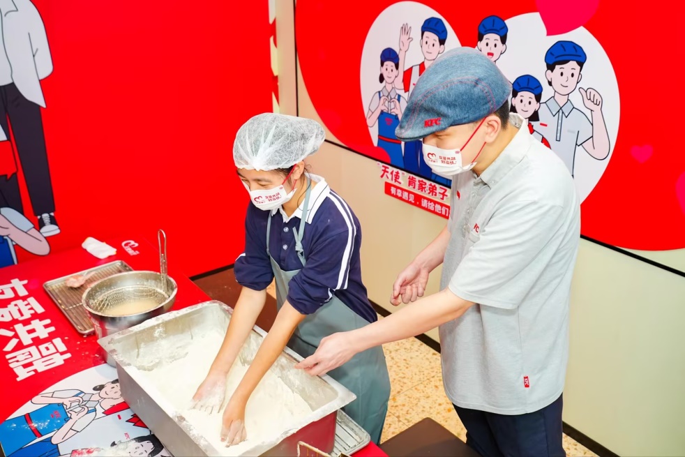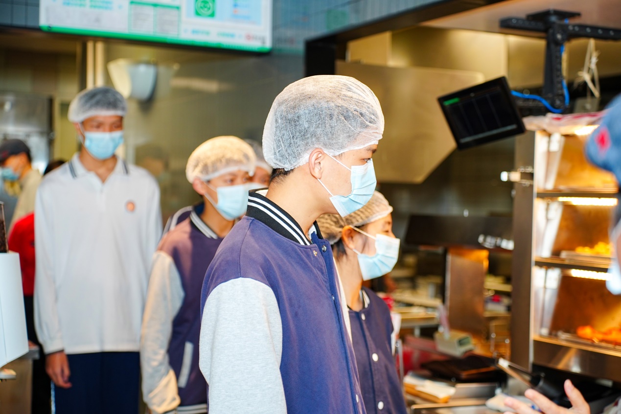 在“美味实践・互动体验” 环节,天使员工展飞是此次实践教学的核心导师之一。他不仅在肯德基深耕十年,更是珠海特殊教育学校的第一届毕业生。从初入职场时的青涩生疏,到如今对各类繁琐复杂的工作内容熟稔于心、信手拈来,展飞用流畅的裹粉操作、细致入微的步骤讲解,为学弟学妹们上了一堂生动鲜活的职业实践课。另一位老师益财也是在餐厅工作了十年资深天使员工,虽然肢体上不如常人灵活,但他在岗位上练就的熟练标准的产品制作技巧不输任何人。在两位老师的带动下,学生兴致高昂地认真学习,纷纷动手尝试,在一次次调整与练习中掌握技能,为自己制作出了一份份合格的美味餐点,大家脸上洋溢着收获的喜悦。