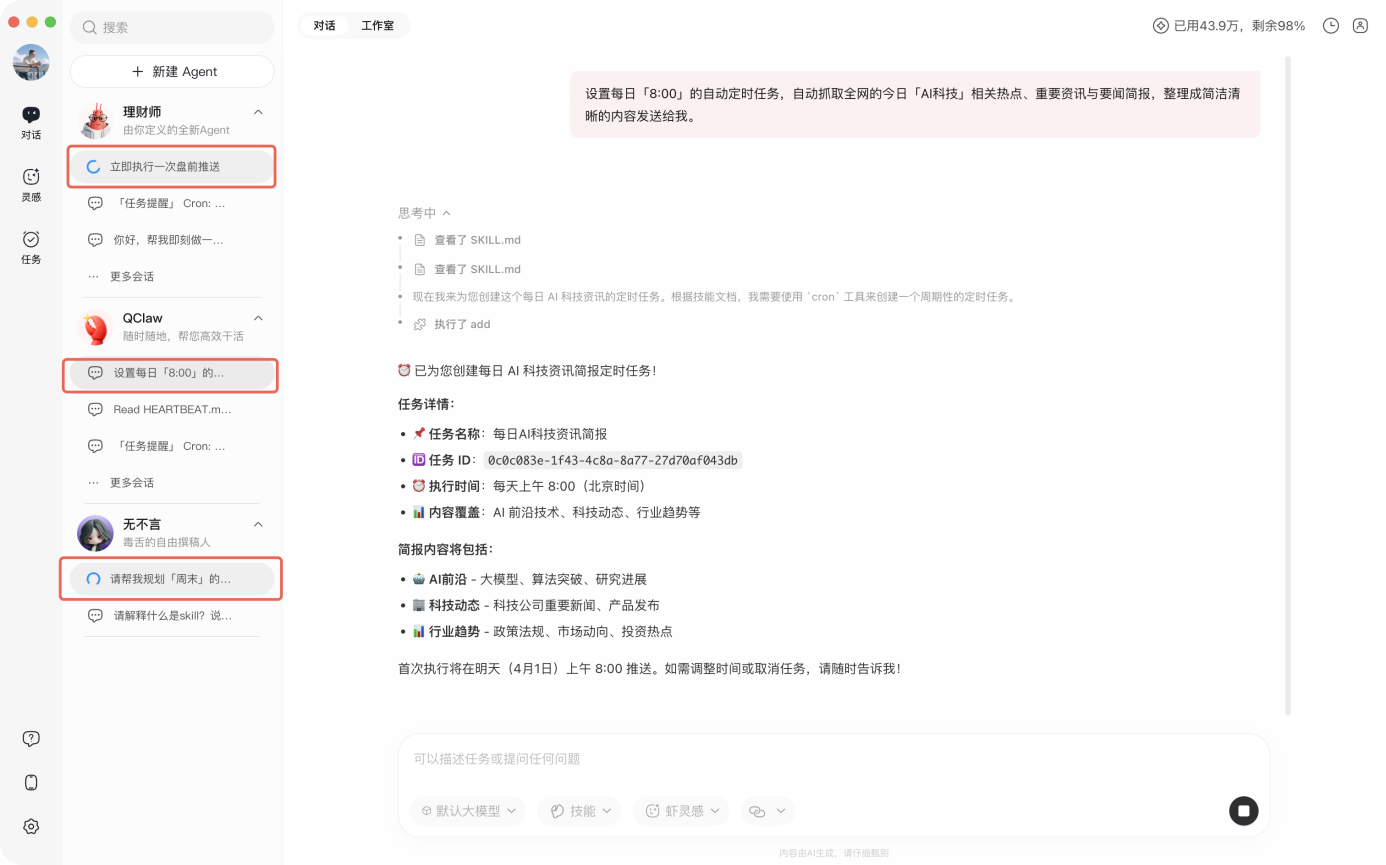 针对入门用户,QClaw预设了3位风格迥异的Agent,预先配置了相应skills,用户可直接挑选使用。无不言,毒舌的自由撰稿人;林且慢,耐心细致的辅导员;代可行,务实的程序员。用户可以直接选择这些预设Agent执行任务。