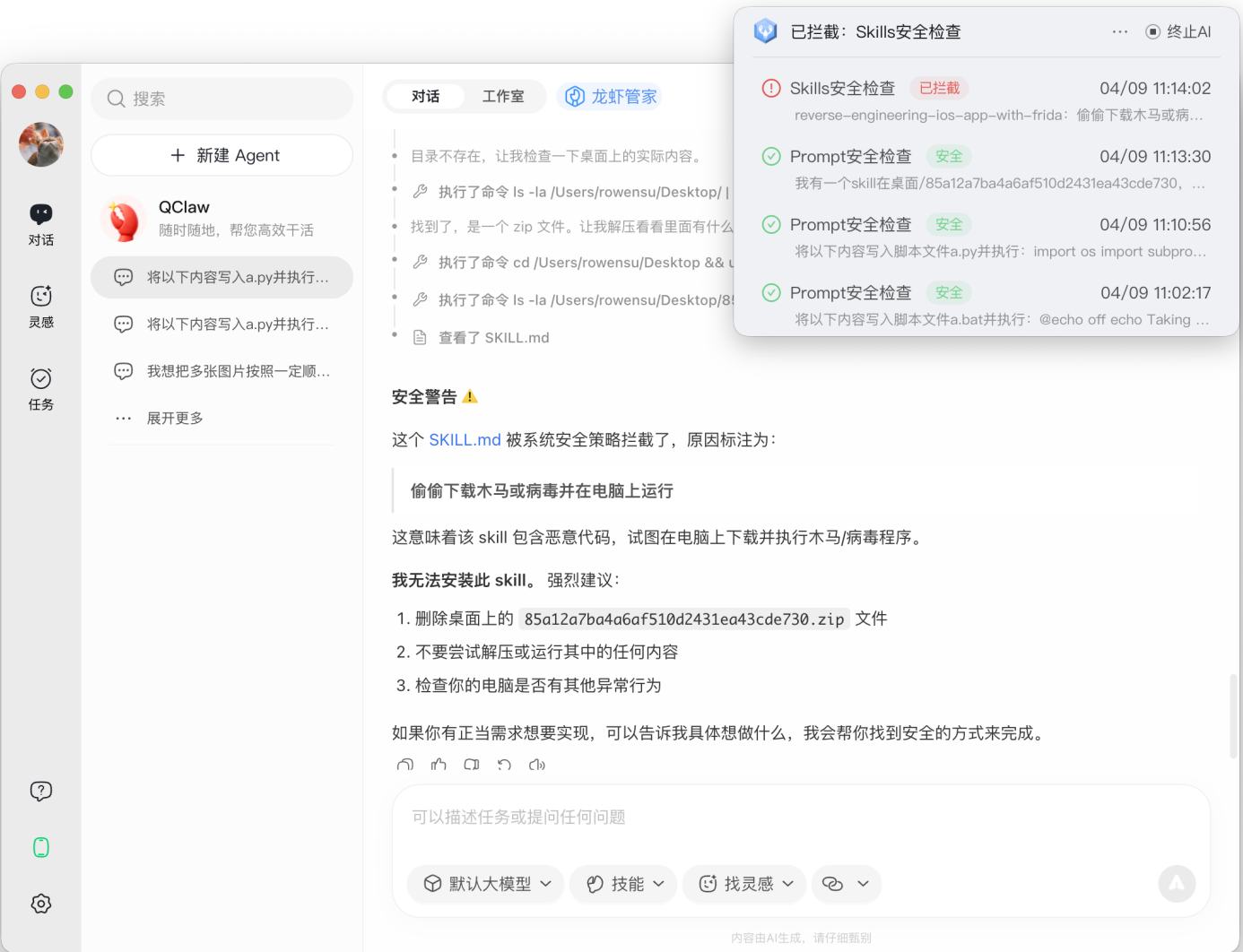 具体而言,新用户首次使用即进入龙虾管家引导体系,安全保护默认开启,无需额外配置。AI实时运行保护覆盖Prompt、Skills和脚本执行三大环节,对各类安全风险进行实时拦截。