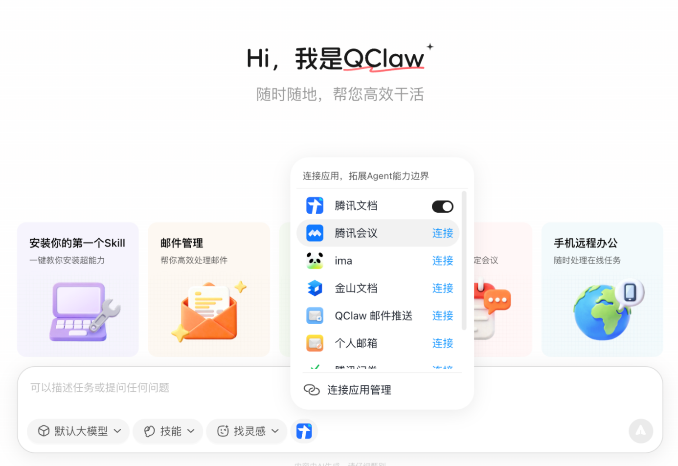 为了解决用户使用 Agent的“最后一公里”问题,QClawV2版本上线“连接器”功能,接入腾讯文档、腾讯问卷、腾讯会议、ima知识库、金山文档、Notion、邮箱等众多主流应用,更多应用正持续接入中。