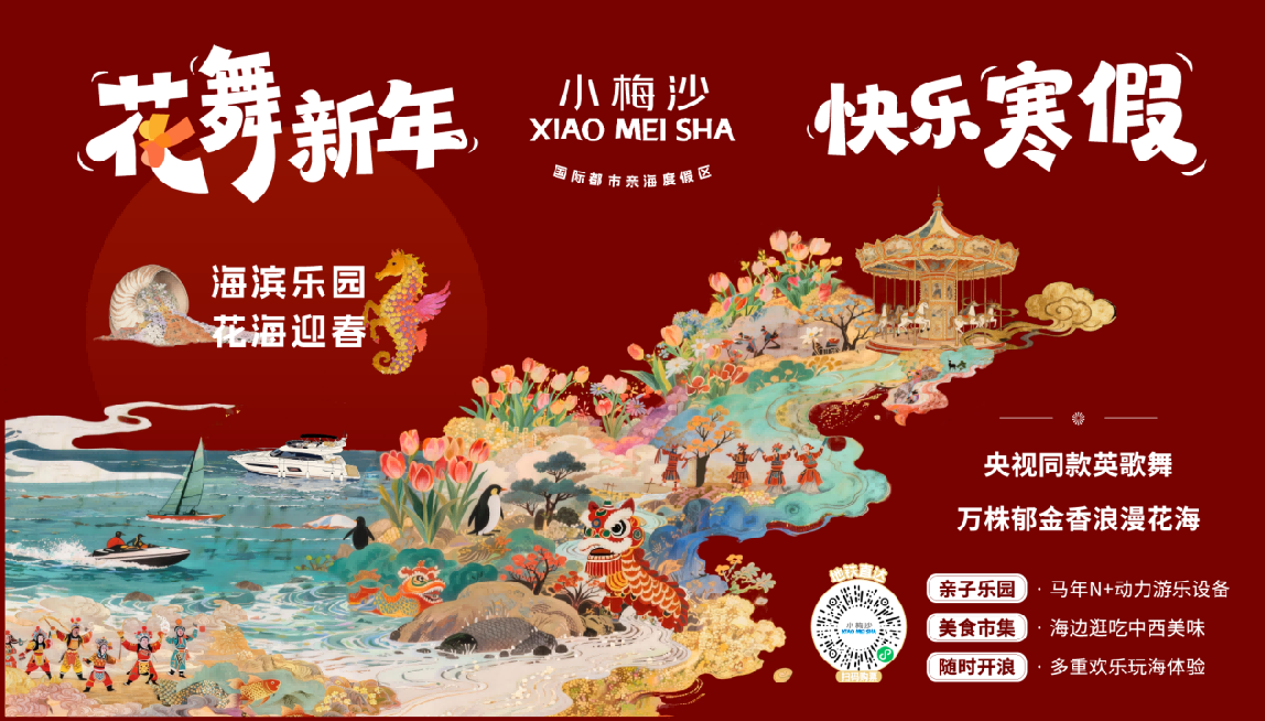 骏马踏浪辞旧岁,花漾梅沙迎新春。随着丙午马年春节脚步的临近,深圳小梅沙以“花舞新年,快乐寒假”为核心主题,倾情打造马年新春系列精彩活动,小梅沙海洋世界、小梅沙海滨乐园和深圳美高梅酒店文旅业态联动,融合传统文化、民俗非遗和海洋元素为市民游客呈现一场新春盛宴。目前,小梅沙寒假春节特惠票已经开售,海洋世界双人限量春节早鸟票低至299元,快乐寒假家庭票(2大1小)低至480元,2人同行快乐寒假学生票低至180元,更多优惠请关注“小梅沙官方”微信小程序。