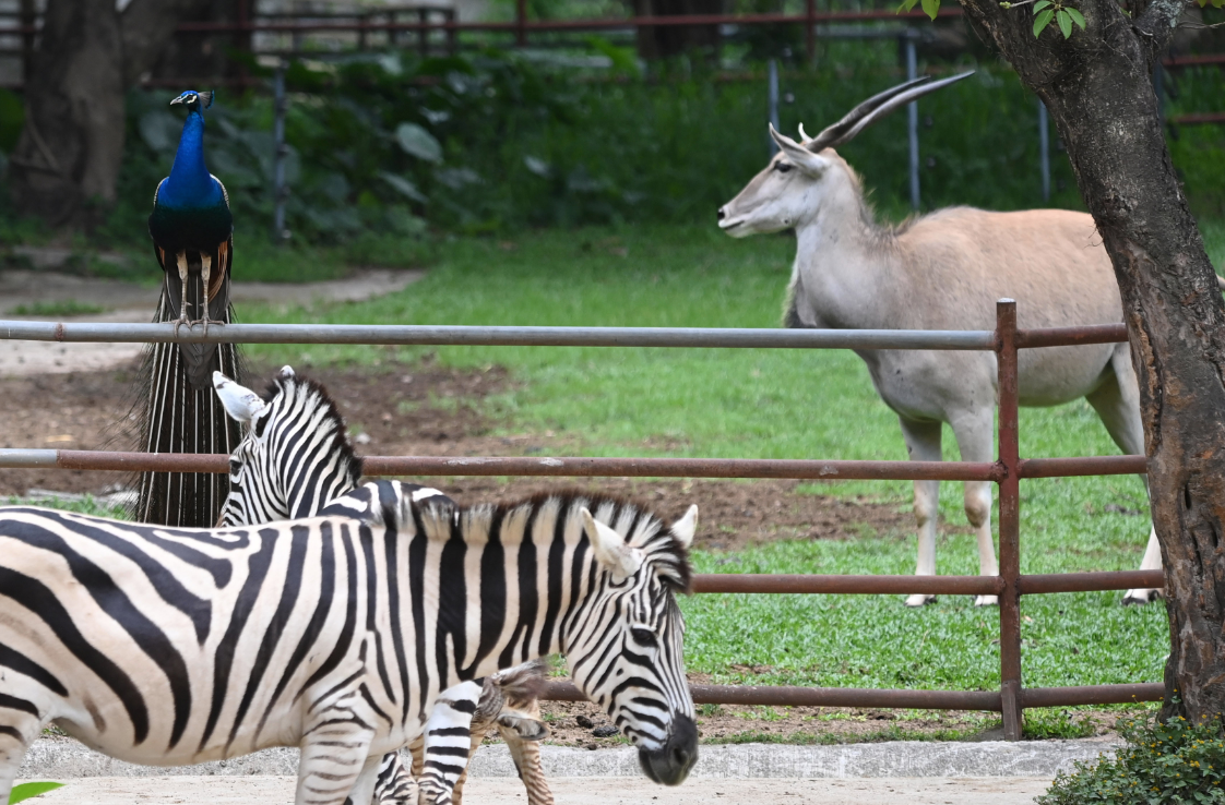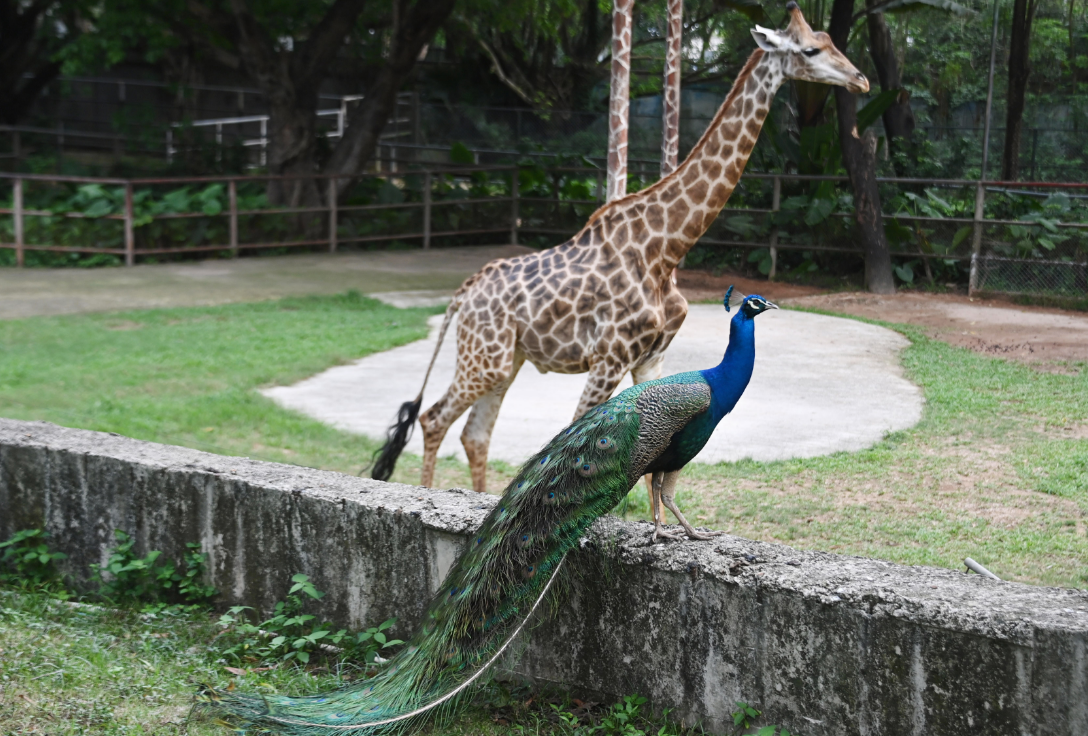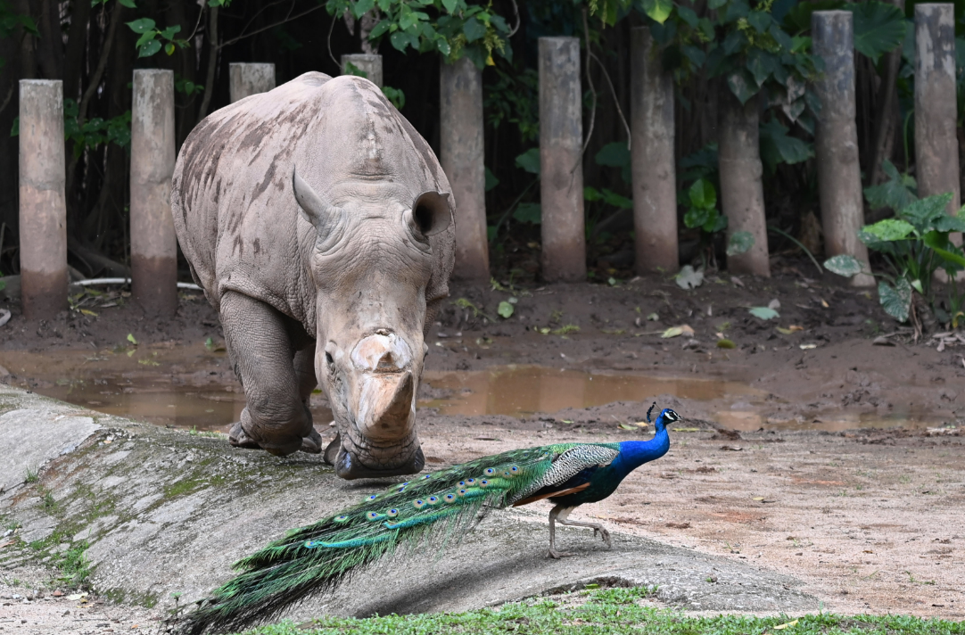4月8日,记者从深圳野生动物园了解到,该园的一些雄性孔雀各自走进犀牛、长颈鹿、斑马、摩弗伦羊、大羚羊等动物展区内,雄孔雀拖着艳丽尾屏与各种动物“同框”,相映成趣。给春天里的动物园增添了不少“萌趣”。
