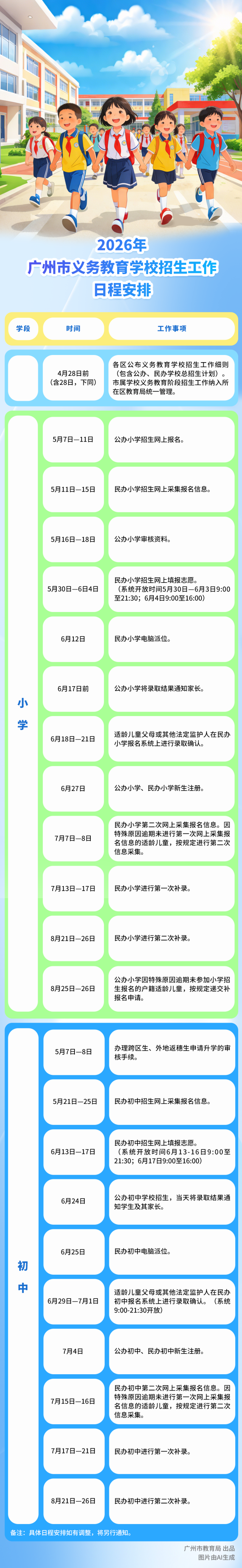 目前,2026年招生政策尚未公布。根据广州市教育局此前公布的《2026年广州市义务教育学校招生工作日程安排》,广州市各区义务教育学校招生工作细则(包含公办、民办学校总招生计划)将于4月28日前(含28日)公布。市属学校义务教育阶段招生工作纳入所在区教育局统一管理。