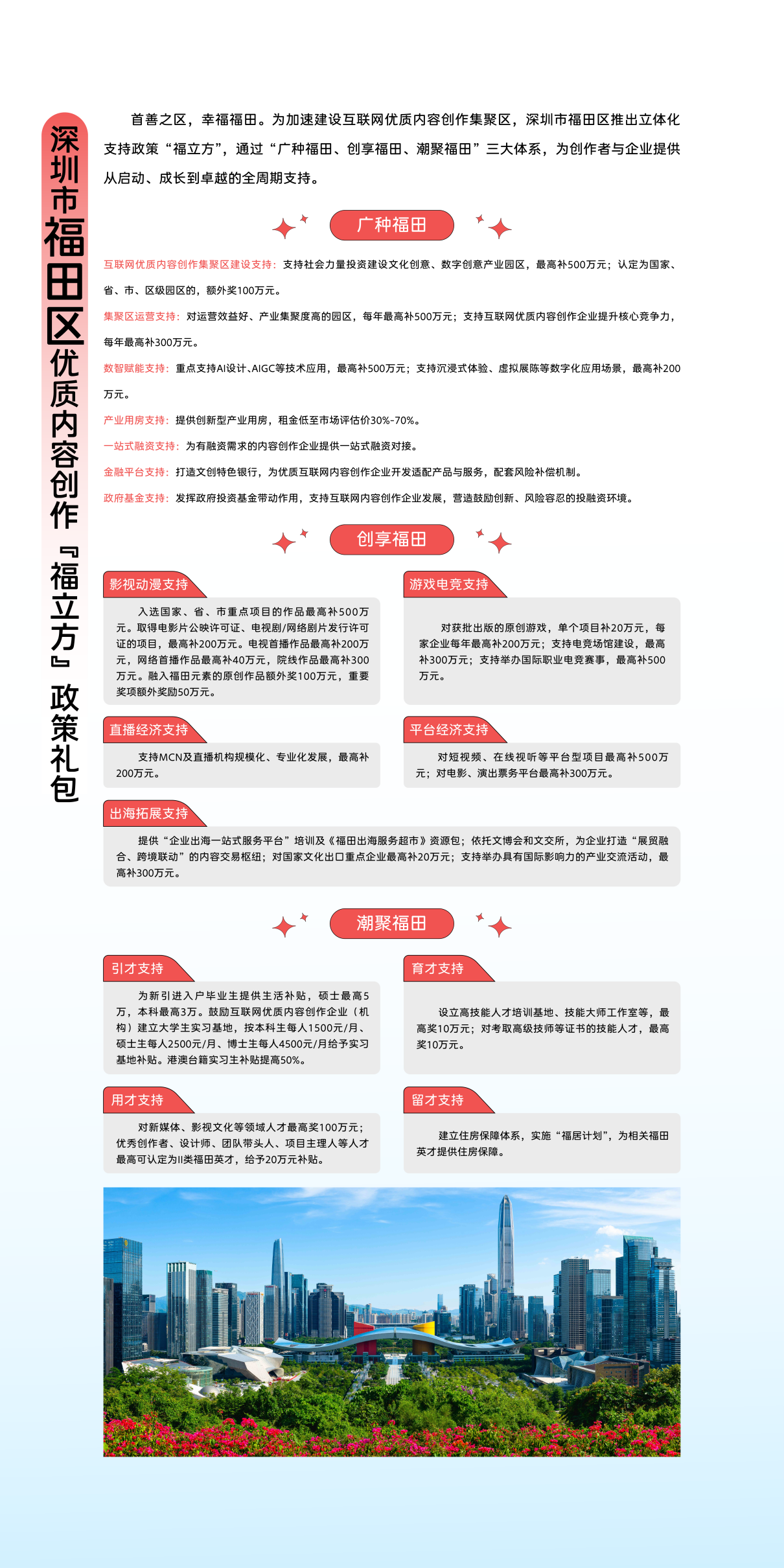 在福田,好内容能遇见最懂它的政策。为加速建设互联网优质内容创作集聚区,福田推出立体化支持政策“福立方”,通过“广种福田、创享福田、潮聚福田”三大体系,为创作者与企业提供从启动、成长到卓越的全周期支持。