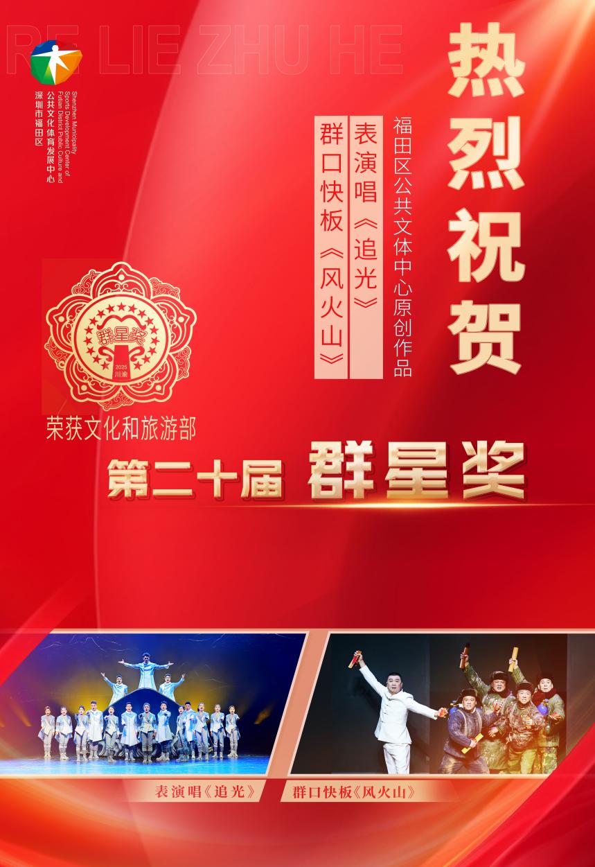 金秋送爽,硕果盈枝。11月4日,第二十届全国 “群星奖” 评选结果揭晓。这一我国群众文化领域的最高奖项,再次为全国群众文艺作品创作划定 “标杆”。深圳市福田区创作的表演唱《追光》与群口快板《风火山》不负众望、双双夺魁,以“双子星”之姿在全国舞台绽放“福田光彩”,不仅实现了福田群众文艺发展的历史性突破,更成为深圳建设“文化创新之都”的生动注脚。