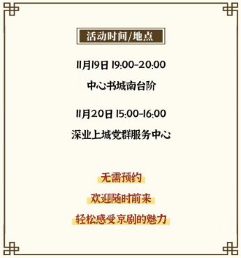 本届艺术周创新推出"京剧进商圈"活动,将于11月19日在中心书城南台阶、11月20日在深业上城党群服务中心举办两场公益京剧讲习所。国家京剧院一团一级演员危佳庆和王好强老师将带领观众深入了解京剧的历史渊源、艺术特色和表演精髓,通过现场讲解、互动体验和精彩表演,让传统艺术自然地嵌入城市肌理,打造传统文化传播的"深圳样本"。这种将高雅艺术融入商业空间的新模式,让市民们在日常生活场景中就能自然而然地接触和了解国粹艺术,真正实现文化惠民"零距离"。