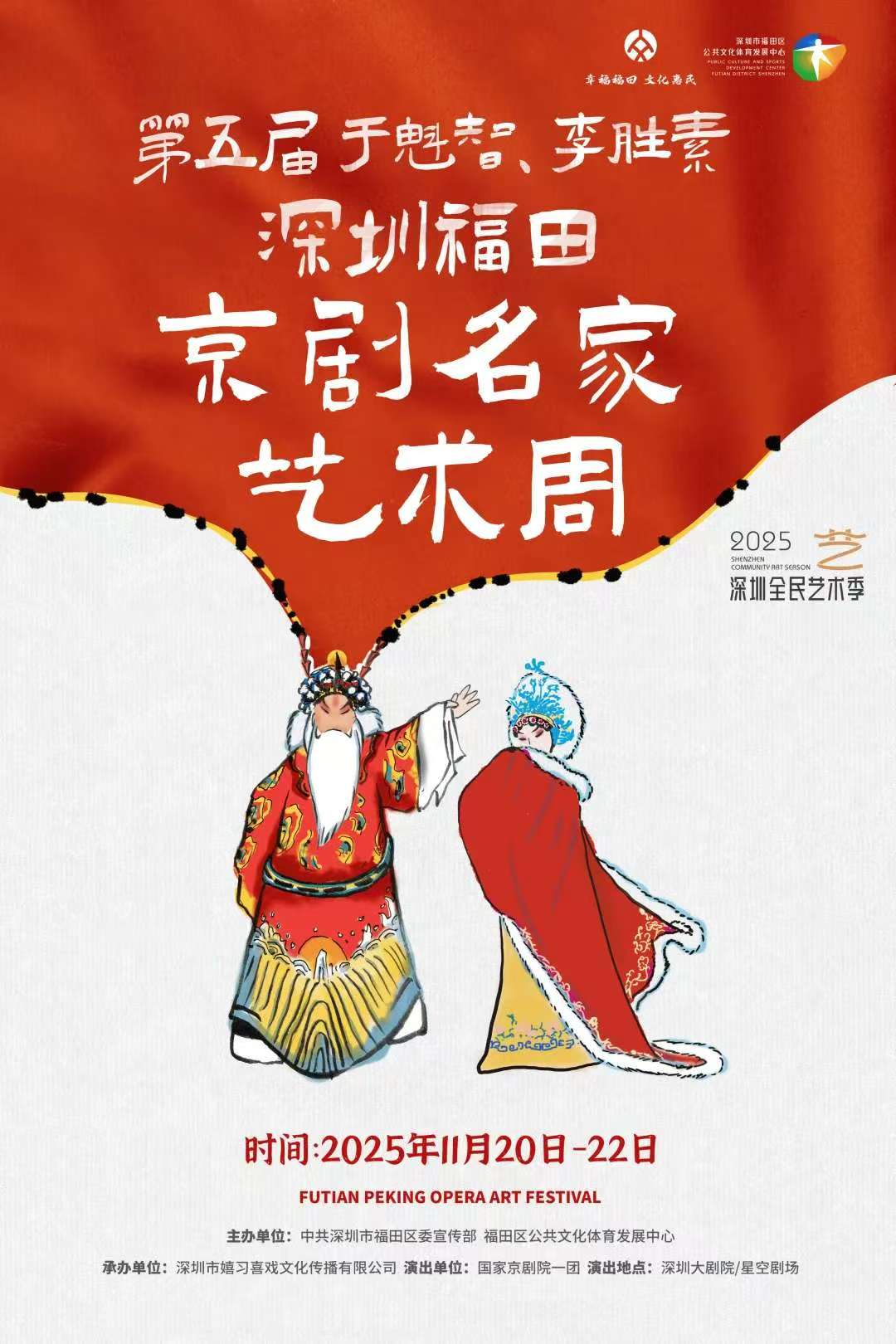 近日,由中共深圳市福田区委宣传部、福田区公共文化体育发展中心主办,深圳市嬉习喜戏文化传播有限公司承办的2025第五届于魁智、李胜素深圳福田京剧名家艺术周,将于11月19日至22日在深圳大剧院、星空剧场、中心书城南台阶、深业上城党群服务中心隆重举行。五载耕耘铸就文化经典,本届艺术周将继续秉持“名家阵容、国粹京剧普及、公益惠民”的宗旨,为深圳市民献上3场高水平的经典大戏及2场公益京剧讲习所。