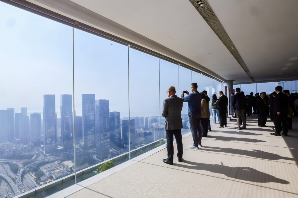 考察活动的终点,设在深业上城的“城市云客厅”。在300米高空环视全景,此前的点状震撼整合为完整的 “产城人”融合画卷。作为福田六大集中连片开发区域的重要组成,深业上城以基金小镇为核心载体,成为衔接香蜜湖金融资源、赋能实体经济的关键枢纽,而这一枢纽地位的形成,离不开福田区全域统筹的空间规划与产业布局支撑。