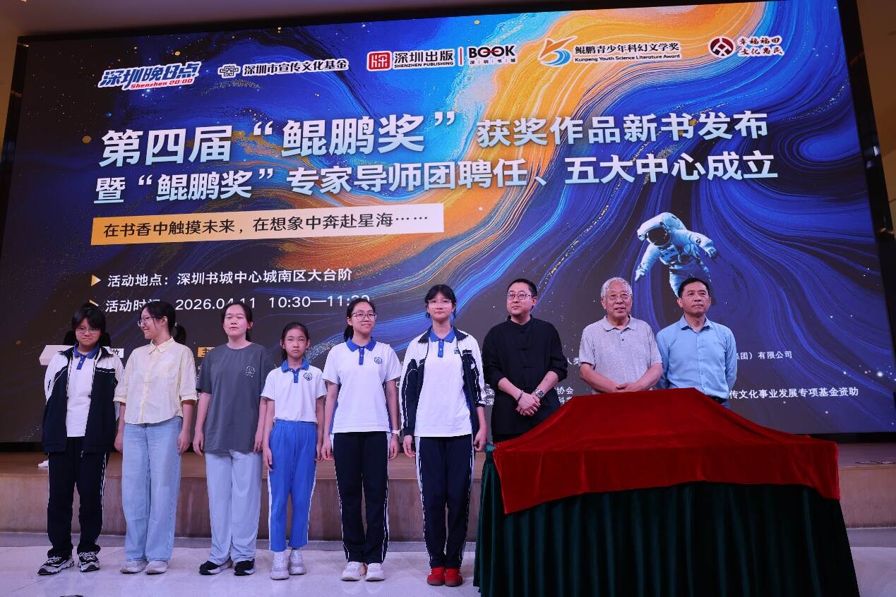 4月11日上午,2026鲲鹏科幻文化周系列活动之一“第四届‘鲲鹏奖’获奖作品新书发布暨‘鲲鹏奖’专家导师团聘任、五大中心成立”活动在深圳书城中心城南区大台阶举行。