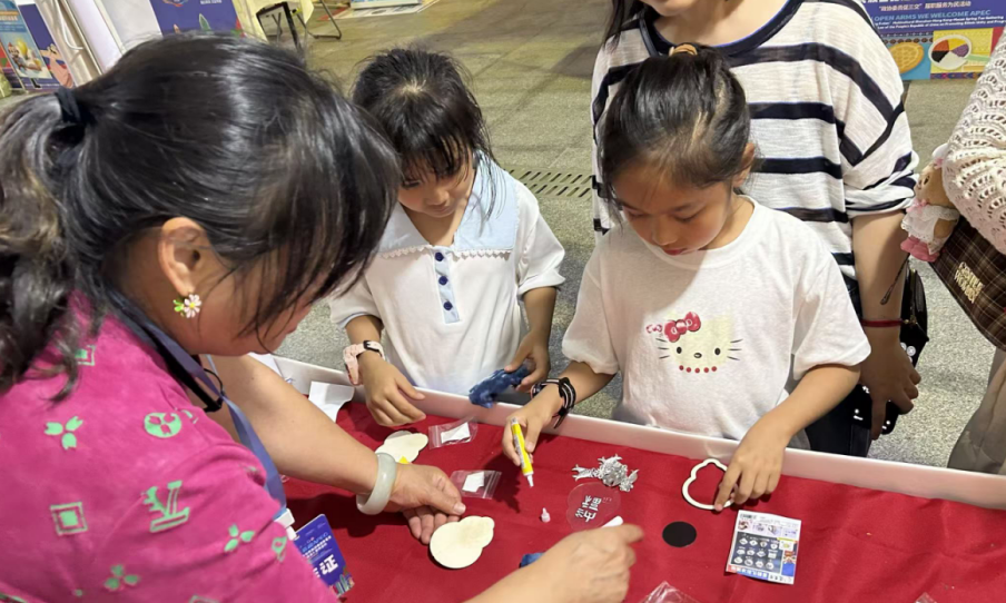 在水围文化广场非遗手工艺展示区,现场集中展示了非遗粉彩瓷、苗绣、马尾绣、篆刻、剪印、竹编、傣锦等多种民族手工艺品。非遗传承人不仅现场讲解文化、演示技艺,还指导居民亲手体验制作。群众可零距离观赏和接触各类非遗作品,并通过“一笔一划”的动手过程,感受不同民族工艺的特色与智慧。活动现场参与积极,许多居民特别是亲子家庭热情投入互动体验,在动手制作与交流中,增进了对多元民族文化的感知,营造了良好的社区交融氛围。