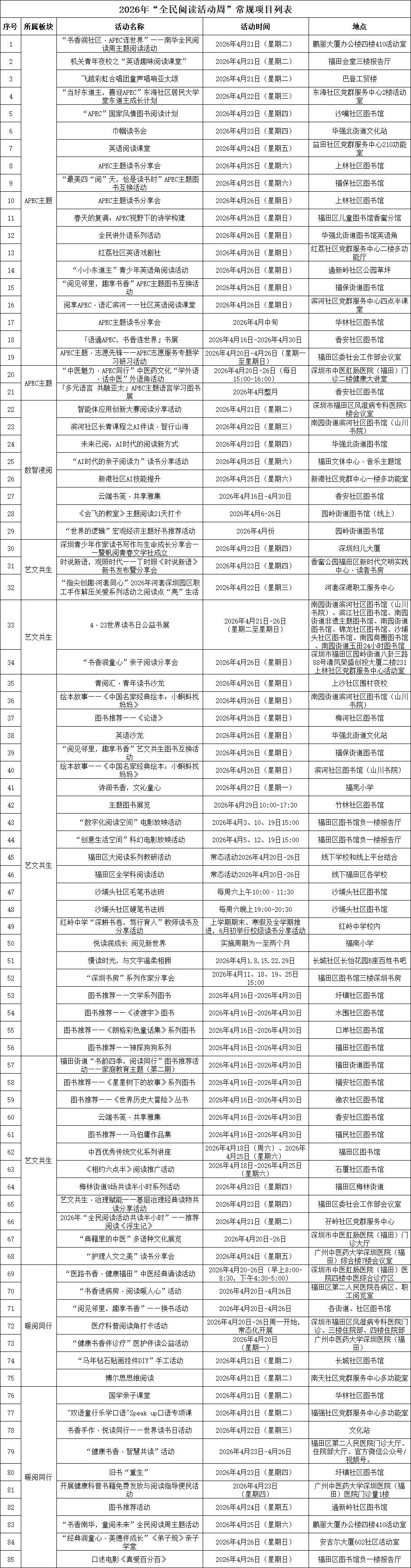 (注:具体活动信息请关注“福田区图书馆”公众号、各单位、街道、社区公众号。)