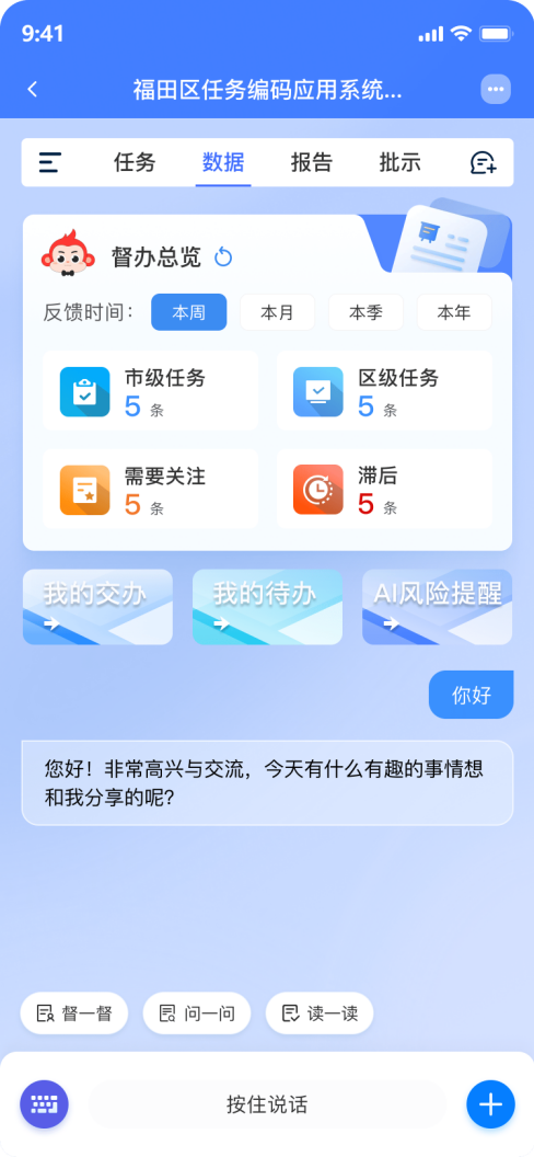 针对基层办公负担重,打造AI督办助手,以“AI+编码”为核心驱动,创新构建覆盖“办文、办会、办事”的政务办公智能体体系,全量标准化汇聚治理督查任务,梳理任务全生命周期流程并通过智慧化手段精简环节30%,生成单个任务工单从5分钟缩短至10秒,生成拟办意见从5分钟缩短至30秒,让数据“一次录入、多方关联”,重复填报减少50%。