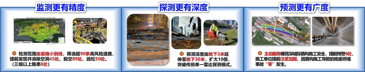在应急管理领域,创新推出地面坍塌综合监测预警体系,结合多源遥感数据与机器学习算法,完成地面坍塌易发性预测预警智能模型构建,精选靶区、重点监测,实现高精度微动监测和动态数据分析,探测深度延伸至地下30米。2025年以来,已成功发现并消除184处空洞、脱空及疏松隐患,成功入选应急管理部“星火计划”,获评第五届安全科学技术奖“科技进步”一等奖。