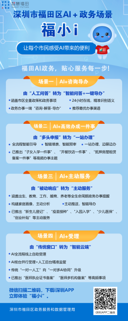 福田区深入贯彻落实“人工智能+”行动意见,印发《福田区打造人工智能先锋城市核心区工作方案(2024-2026年)》,实施“模力福地”十大行动,全面推进 AII in AI、AII by AI、AII from AI:以制度建设为基础,全国率先出台政务辅助智能机器人管理办法及实施细则;以场景为驱动,上线民生诉求助手、AI督办助手、福小i等43类AI数智员工;以安全合规为底线,出台人工智能大模型安全管理规范指引,坚持100%使用国产模型及算力;以应用促产业,设立“福田场景超市”,发布1044个应用场景,集聚优质AI企业。