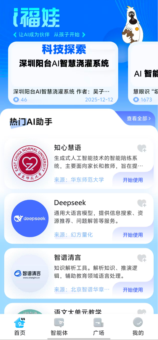 在教育领域,构建教育人工智能应用治理体系,率先出台教育人工智能应用“二十五条举措”,获教育部全国转发推广,实施“五个一”校园工程,为每所学校配备AI应用场景,全国首发教育智能应用生态门户“i福娃”,上线超110个人工智能大模型、工具及智能体,实现与国家智慧教育平台互联,打造21所人工智能应用项目校和178个应用场景。