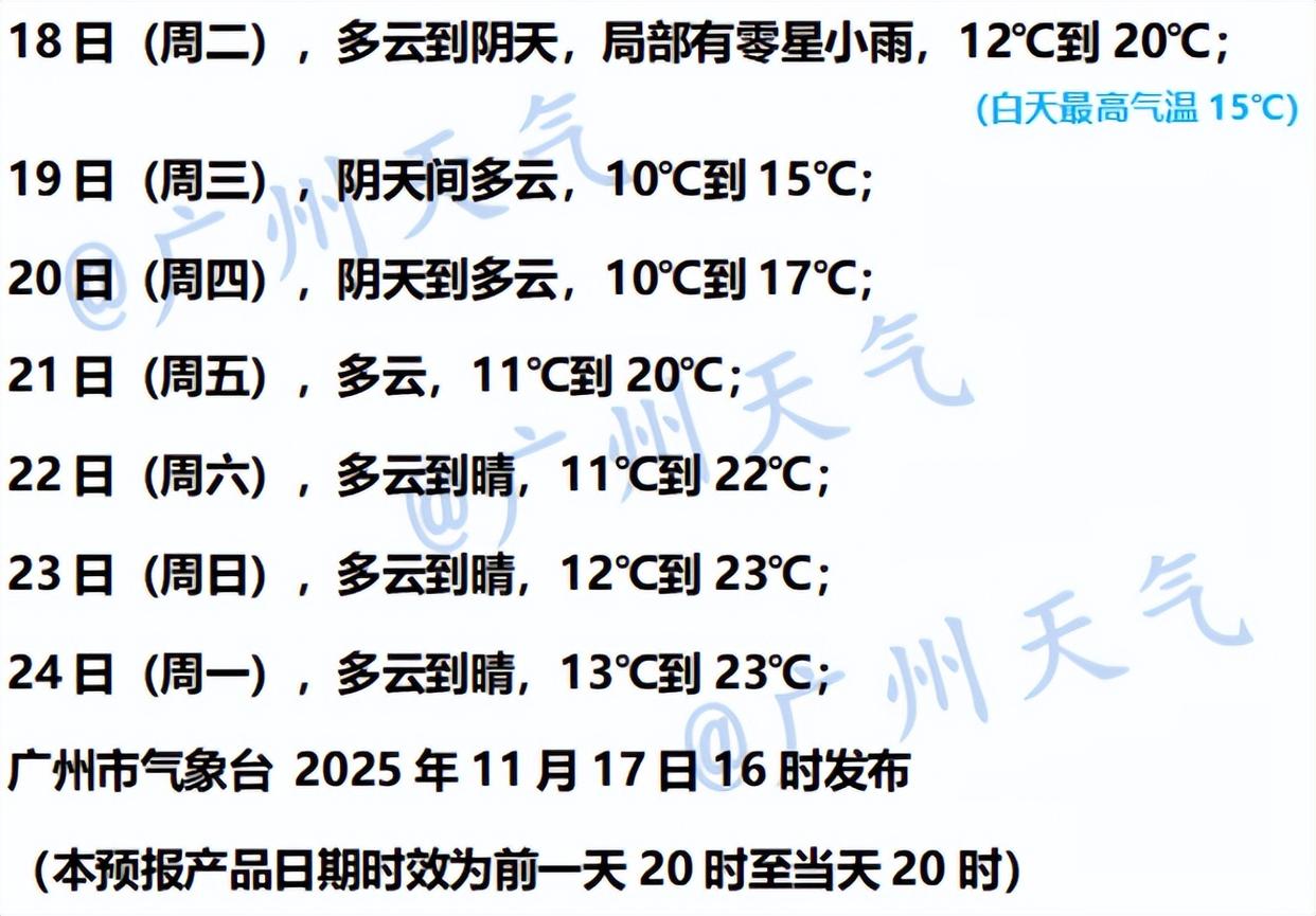 广州市气象台预计,11月18日—19日受强冷空气影响,广州多云转阴天,局部有零星小雨,最高气温下降至15℃左右,最低气温下降至10℃左右,陆地阵风加大至5~7级,港区和高地阵风7~9级。11月20日阴天到多云,气温10~17℃,风力逐渐减弱。