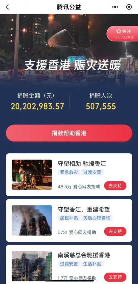 与此同时,由中国社会福利基金会发起“守望相助 驰援香江”——香港大埔火灾紧急救援行动项目已于11月27日晚间上线腾讯公益平台,该项目旨在筹集善款、搭建桥梁,全力支援灾后救助工作,帮助受灾人员渡过难关。公众可以通过腾讯公益小程序、腾讯新闻专题页面、QQ浏览器等渠道,参与项目捐赠,为受灾人员献出一份爱心。截至11月29日上午9点,已有超过50万人次的爱心网友通过腾讯公益平台,为多个支援香港项目捐赠善款超过2000万元。