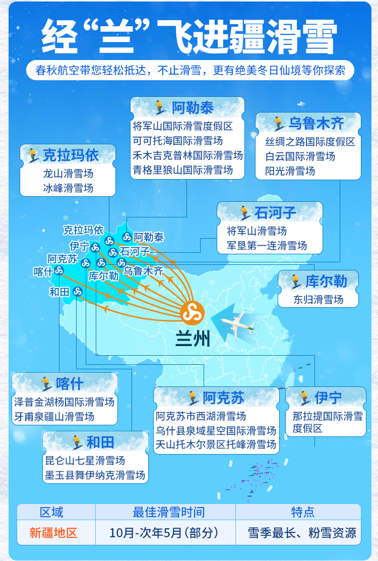 深圳市民可选择春秋航空9C6165深圳-兰州,7:35-10:50,再经兰州中转进疆的联程航线,深入人类滑雪起源地,体验亚洲顶级粉雪的极致魅力。