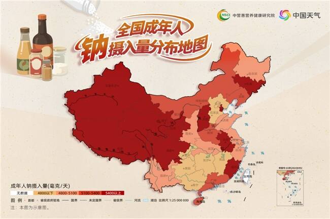 中营惠营养健康研究院与中国天气联合发布的《全国成年人钠摄入量分布地图》