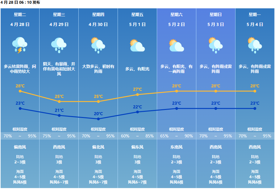 珠海市气象台4月27日下午发布天气预报,预计28-29日,受冷暖气流交汇影响,我市有一次暴雨过程,并伴有雷电和短时大风。5月1-2日是降雨间歇期,仅局部会有短时阵雨。5月3日起天气转不稳定,4-5日雷雨活跃。假期后期的降雨强度和具体影响时间目前仍有变数,市民请及时关注天气预报。