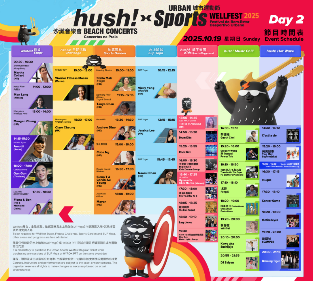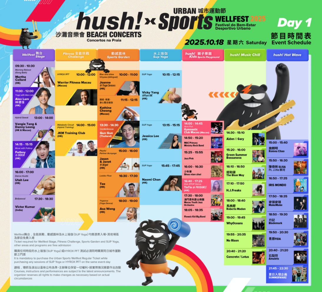 “hush! 沙滩音乐会 x 城市运动节“主活动将于10月18日及19日在黑沙海滩及黑沙临时休憩空间举行,设有”Hot Wave“、”Music Chill“、”hush! Kids亲子乐园“、”Wellfest舞台“、”动感园林“及”全能挑战“六大舞台,一连两日从早到晚带来马拉松式的音乐演出和运动课程。 现场更设有水上瑜伽、音乐剧亲子巡游、音乐荧光跑、艺术装置、美食及文创市集、乐器体验及工作坊等丰富周边活动,响应市民及旅客的不同喜好和需要,共同感受澳门中西荟萃的文化特色,打造澳门作为中西文明交流互鉴的重要窗口。