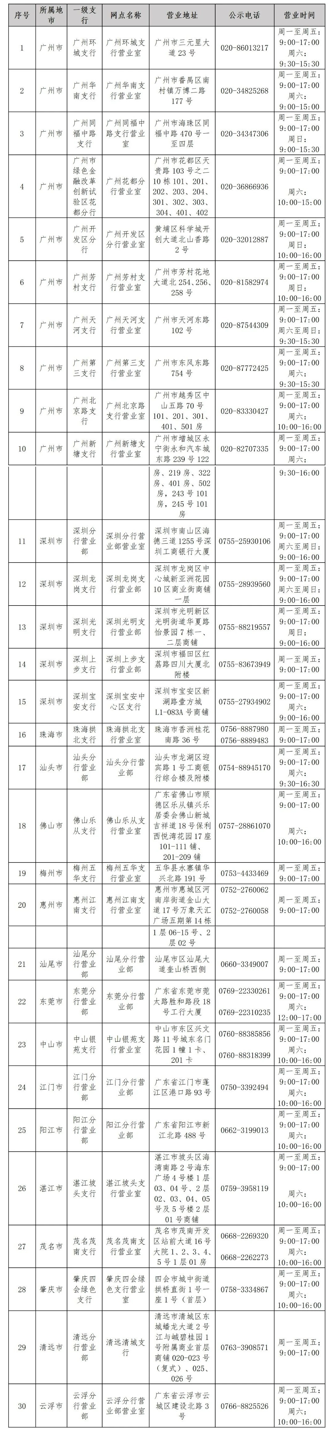 中国工商银行30家网点信息(仅销售广东赛区门票)