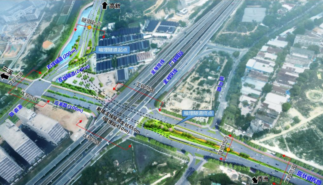 该项目主线采用两幅框架结构下穿金琴快线及广珠城际铁路,按二级快速路(交通性主干路)标准建设,双向四车道,实施长度约680米;设置左右辅线与三溪路平交,辅线按次干路标准建设;三溪路(南福路至金琴快线段)按主干路标准建设,双向六车道,并结合实际条件完善交叉口渠化设计,另外健民路拓宽及现状排洪渠迁改纳入本项目一并实施。