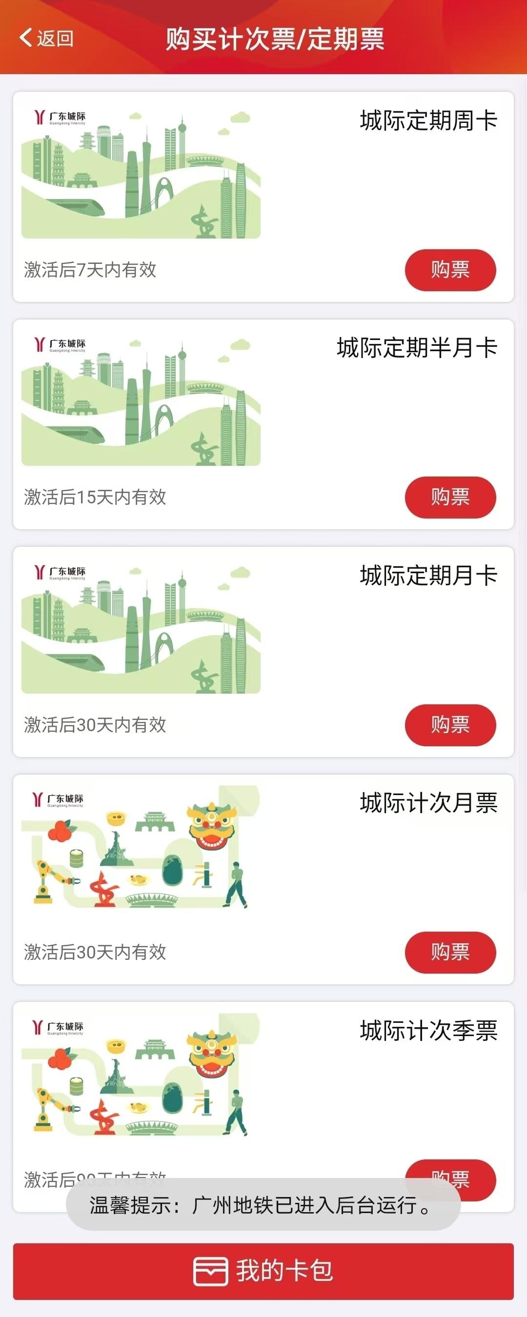 广东城际温馨提醒:打开广州地铁官方APP-乘车码-城际乘车码,点击右上角“+”即可按提示购买,也可点选右下角“卡包”-“去购买”进行购买。优惠票仅向已在广州地铁官方APP通过实名认证并开通城际乘车服务的用户开放。优惠票仅限本人使用,不可转让或共用。