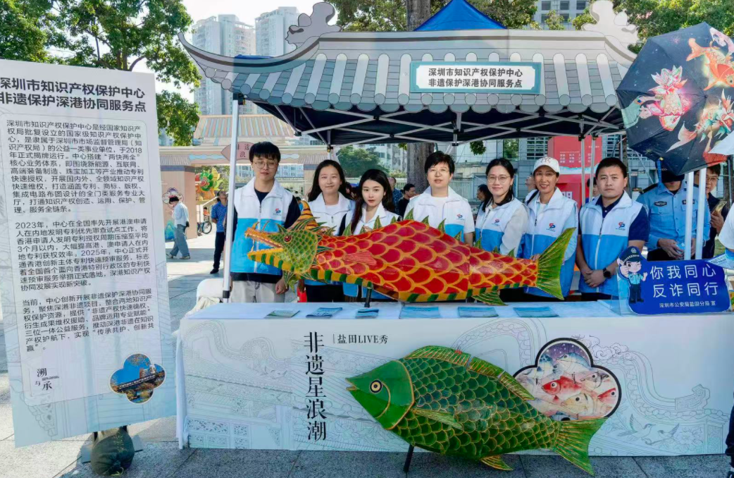 深圳市市场监督管理局(深圳市知识产权局)高度重视非物质文化遗产知识产权保护工作,指导深圳市知识产权保护中心(以下简称“深圳保护中心”)创新构建“非遗产权快速确权、衍生成果维权援助、品牌运用专业赋能”三位一体的保护机制,深度服务深圳市首批国家级非物质文化遗产沙头角“鱼灯舞”,切实将深圳保护中心“20201117”四维全域维权保护机制运用到非物质文化遗产的保护中。即整合各级法院、海关、公安等20家深圳市“一站式”协同保护单位资源,为非物质文化遗产提供立体化保护;发挥深圳市知识产权纠纷调解联盟20家成员单位作用,多元化解非物质文化遗产知识产权纠纷;借助深圳市知识产权志愿者队伍17支分队约600名志愿者“专家、专业、社会”三方面力量,开展非物质文化遗产知识产权科普培训活动;运用深圳保护中心全市11区全域覆盖的分窗口市区联动的快速协同保护体系,延展非物质文化遗产保护触角,助力非物质文化遗产文化与现代产业深度融合,筑牢非物质文化遗产知识产权“保护墙”。