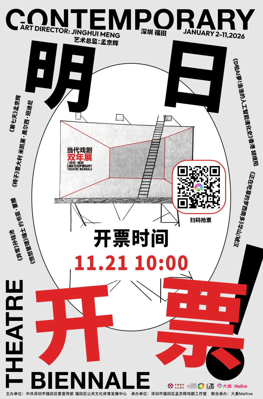 第五届“当代戏剧双年展/深圳·福田”将于2026年1月2日-1月11日举办,由中共深圳市福田区委宣传部、福田区公共文化体育发展中心主办。