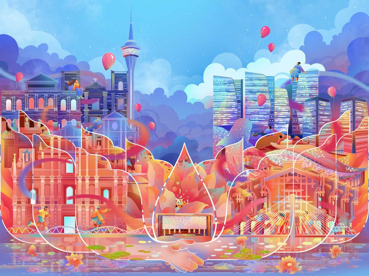 其中,由司徒罗杰创作的插画作品《魅力琴澳》,以其整体性和艺术表现力赢得了评委团的最高评价。该作品以澳门区旗上的莲花为核心创意灵感,海面上的莲花托起横琴与澳门两地,横琴口岸如莲茎贯通其间,主体构图精炼,具备高度的符号性与辨识度。