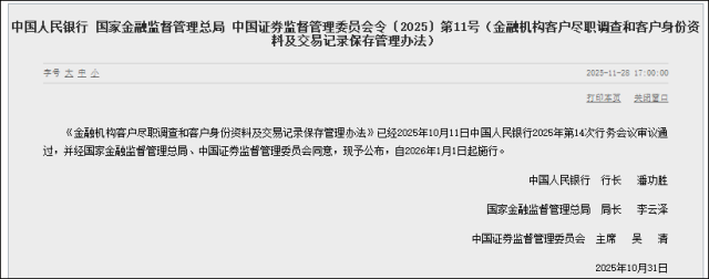 中国人民银行、金融监管总局、中国证监会近日发布《金融机构客户尽职调查和客户身份资料及交易记录保存管理办法》(以下简称《办法》),落实新修订的反洗钱法要求, 自2026年1月1日起施行。