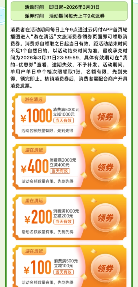 活动期间提供三种便捷领券方式:消费者可打开云闪付APP并定位清远,在首页点击“游在清远 文旅消费券”入口;也可通过首页“粤享暖冬”进入“广东优品购”平台,选择“游在清远文旅活动”;还可到参与活动的商家现场扫码,直达消费券主页领取。消费券采用“先领先得、当天有效”的规则,让市民游客轻松享受文旅优惠。