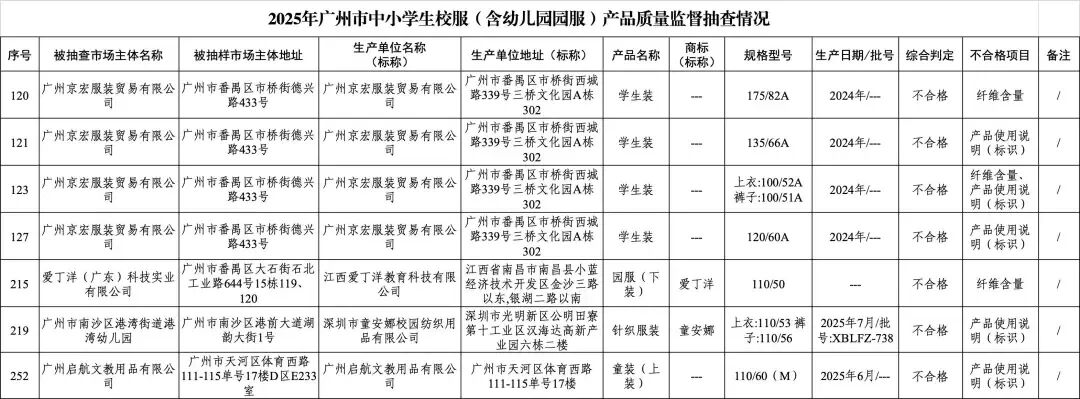 12月4日,广州发布关于抽查中小学校服质量情况通告,发现不合格产品7批次,其中,剔除纯标识不合格,发现实物质量不合格3批次,不合格项目为纤维含量。本次抽样、检验技术服务共监抽50家广州市行政区域内中小学生校服(含幼儿园园服)产品生产者、销售者、学校生产销售的256款中小学生校服(含幼儿园园服)。