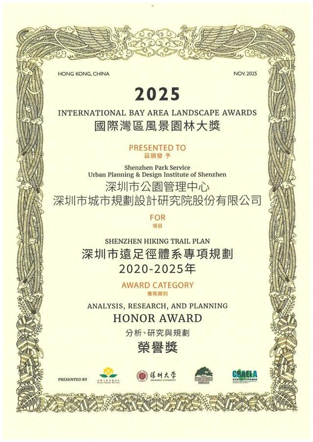 近日,2025国际湾区风景园林大奖颁奖礼在中国香港举行,《深圳市远足径体系专项规划(2020-2025年)》项目在2025国际湾区风景园林大奖分析、研究与规划类别中荣获荣誉奖!