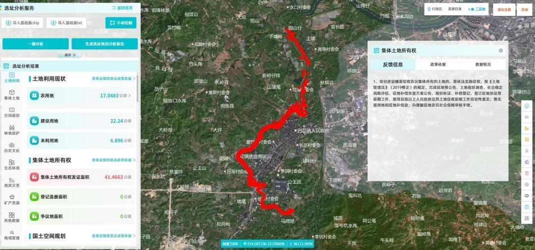 据介绍,互联网版本面向社会公众与行业部门,用户在上传项目红线范围后,可一键完成现状、规划、权属、耕保等70余项空间管控数据的综合分析,系统自动生成选址分析报告。报告不仅呈现项目红线涉及的各类数据压占信息及示意图,还明确列明后续需办理的各项手续与对应政策文件依据,同步提供比选方案,提出最优路线建议。