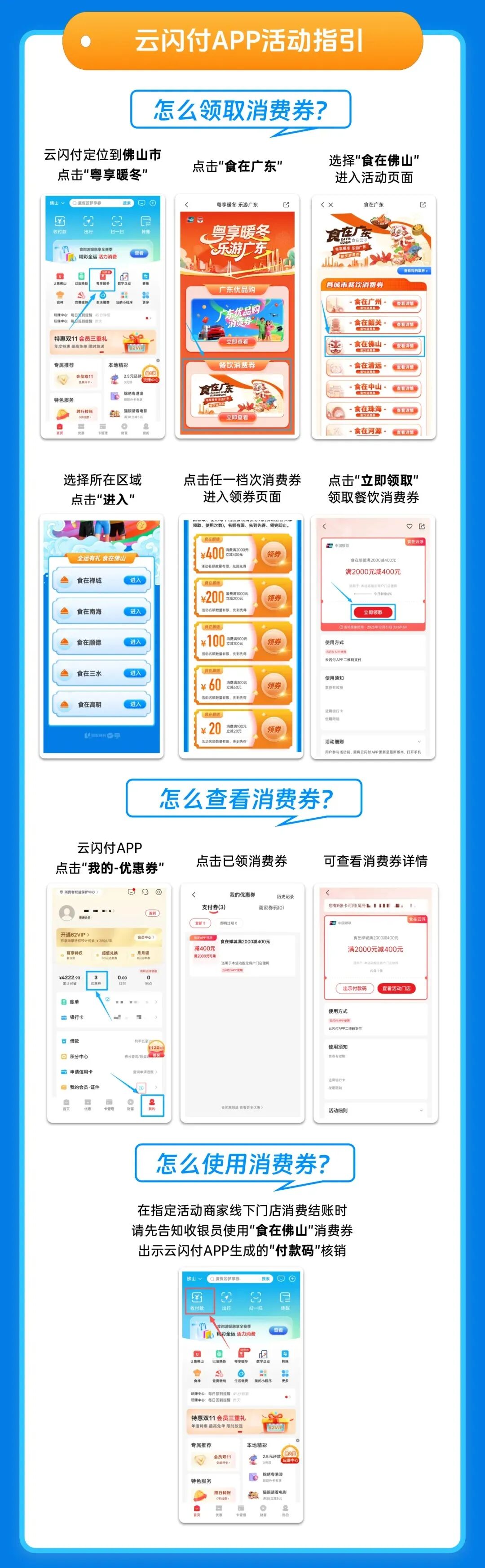 活动期间,消费者在云闪付APP-佛山-政府消费券”或“粤享暖冬”“食在佛山’即可进入活动页面领取消费券。
