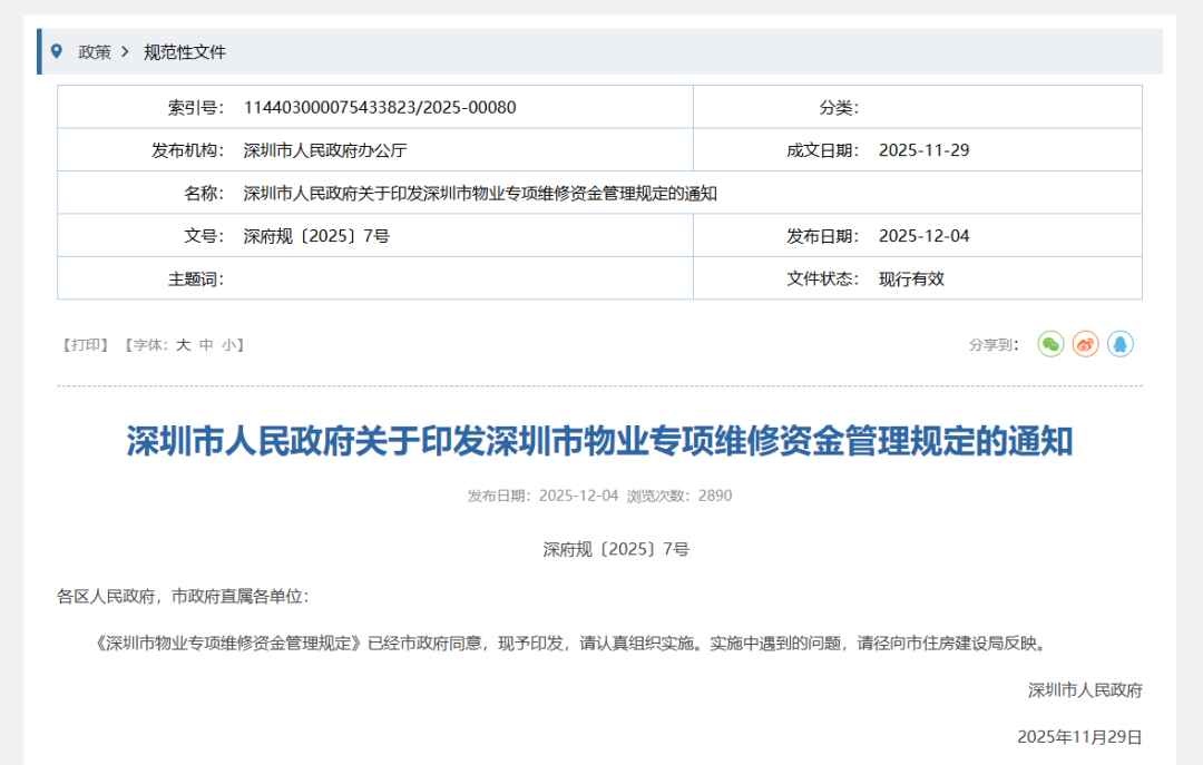 为筑牢房屋安全底线,激活资金保障效能,近日,深圳市政府正式印发《深圳市物业专项维修资金管理规定》(深府规〔2025〕7号,下称新版《规定》)。该政策将于2026年1月1日起实施,标志着深圳物业专项维修资金管理从“资金管控”迈入“全周期服务”的新阶段,为城市高质量发展提供坚实支撑。