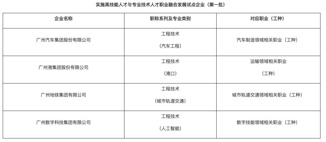 在我市具备专业技术人员职称自主评审权和职业技能等级认定评价资质的大型企业试点,开展技能人才与专业技术人才职业融合发展工作;在广州市市(区)属企业一线从事技能和专业技术工作的复合型人才中试行“以赛代评”。
