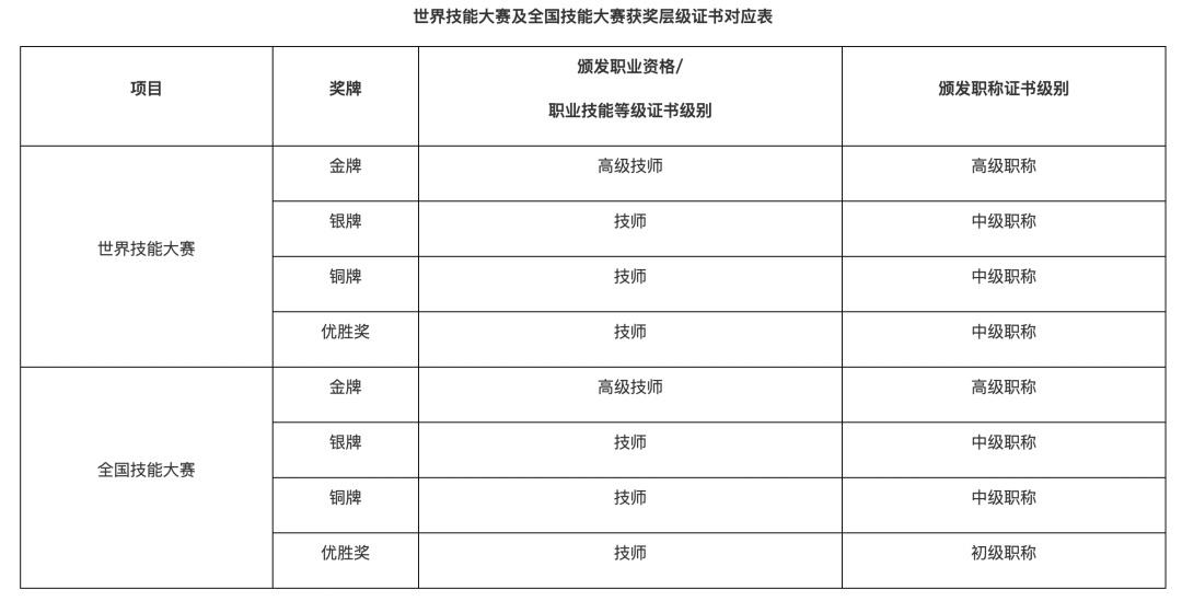“以赛代评”工作中对世界技能大赛、全国技能大赛获得优胜奖以上选手颁发职称证书的,由市人力资源社会保障局组织落实。