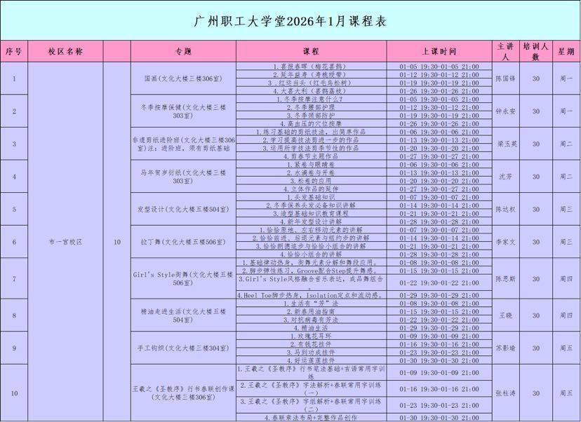 课程安排显示,2026年1月,320节免费课将在广州职工大学堂的8个直属校区开课,包括《马年贺岁衍纸》《发型设计》《减压超轻黏土手工》《八段锦》《彩铅素描画的基础与实践》《篮球》《中医养生》《零基础Ukulele多用途弹唱宝典》等80个专题,其中部分课程为实操课。