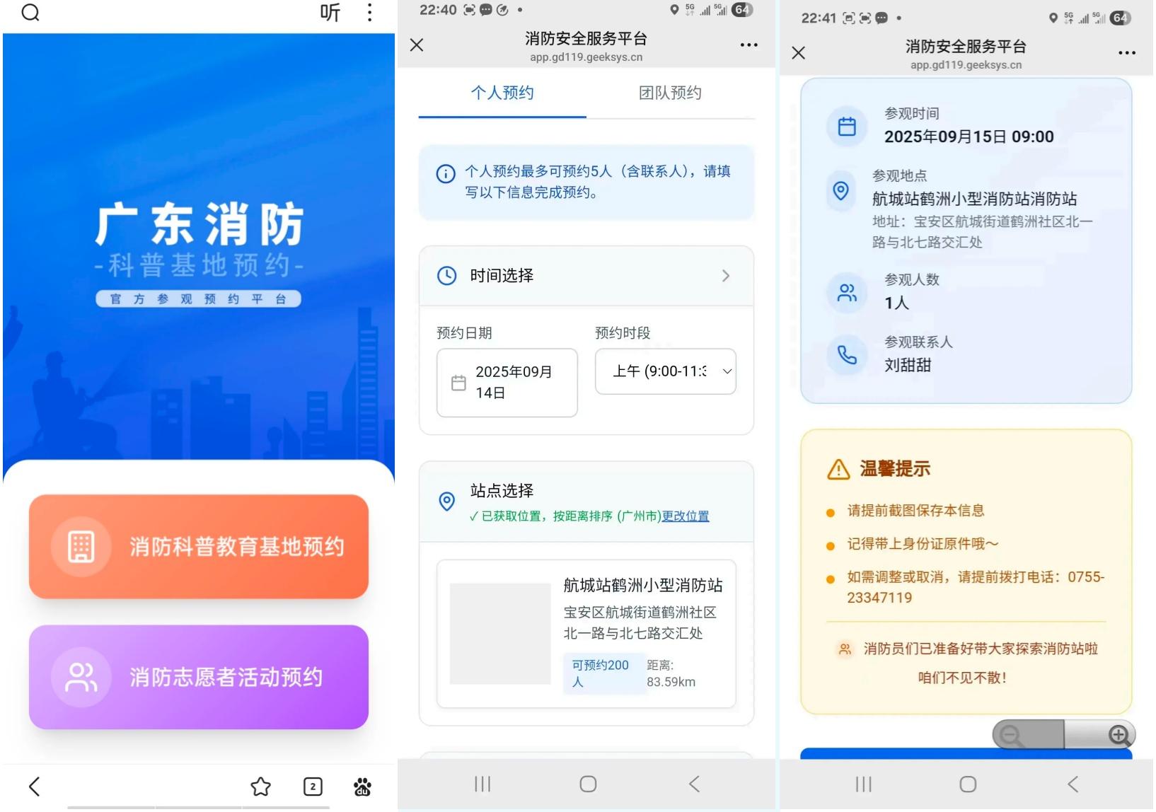 消防站点,一键预约:可通过平台一键预约全省211个消防科普教育基地及常态化开放的消防救援站,操作简便。预约时,选择想参观打卡的场馆所在区域、填写信息并提交后,后台将根据消防站实际运营情况审核,并通过电话或短信反馈结果。特别提醒,参观全程不收取任何费用,谨防有偿参观诈骗;如遇警情等特殊情况,参观安排可能调整,敬请谅解。