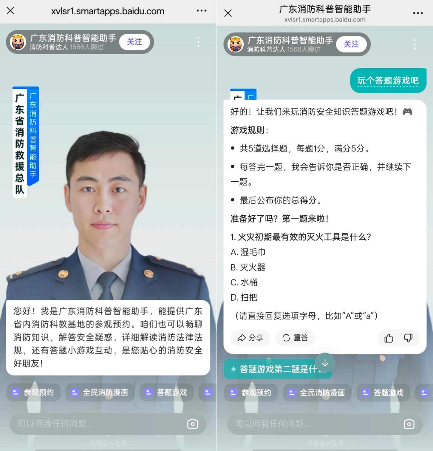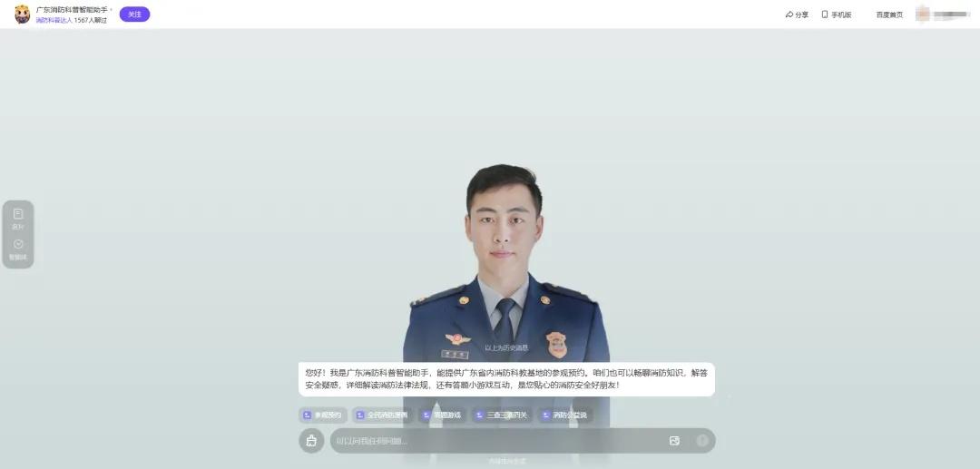 据悉,广大群众只需在百度APP、网页端搜索“广东消防科普智能助手”,即可直接使用。此次上线的消防科普智能平台在全国首创应用了人脸建模、图像处理等技术,坚持“公益开放、全程免费”原则,标志着广东消防在智慧化建设与公共服务数字化转型中迈出关键一步。