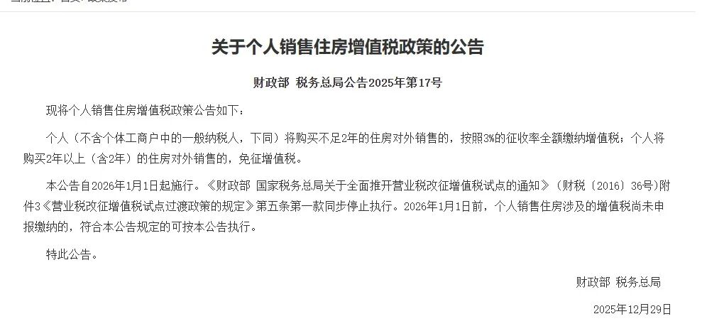 本公告自2026年1月1日起施行。《财政部 国家税务总局关于全面推开营业税改征增值税试点的通知》(财税〔2016〕36号)附件3《营业税改征增值税试点过渡政策的规定》第五条第一款同步停止执行。2026年1月1日前,个人销售住房涉及的增值税尚未申报缴纳的,符合本公告规定的可按本公告执行。