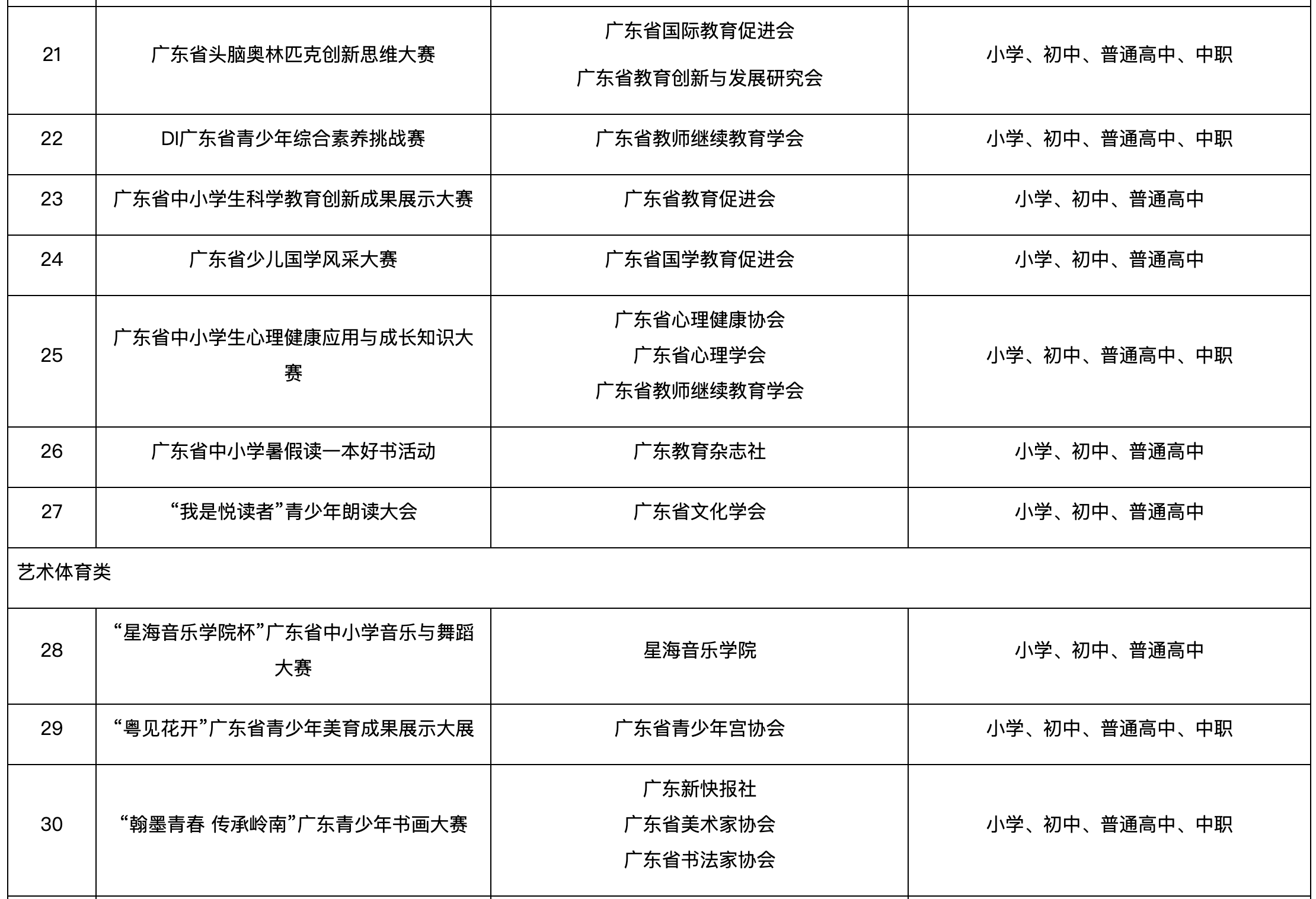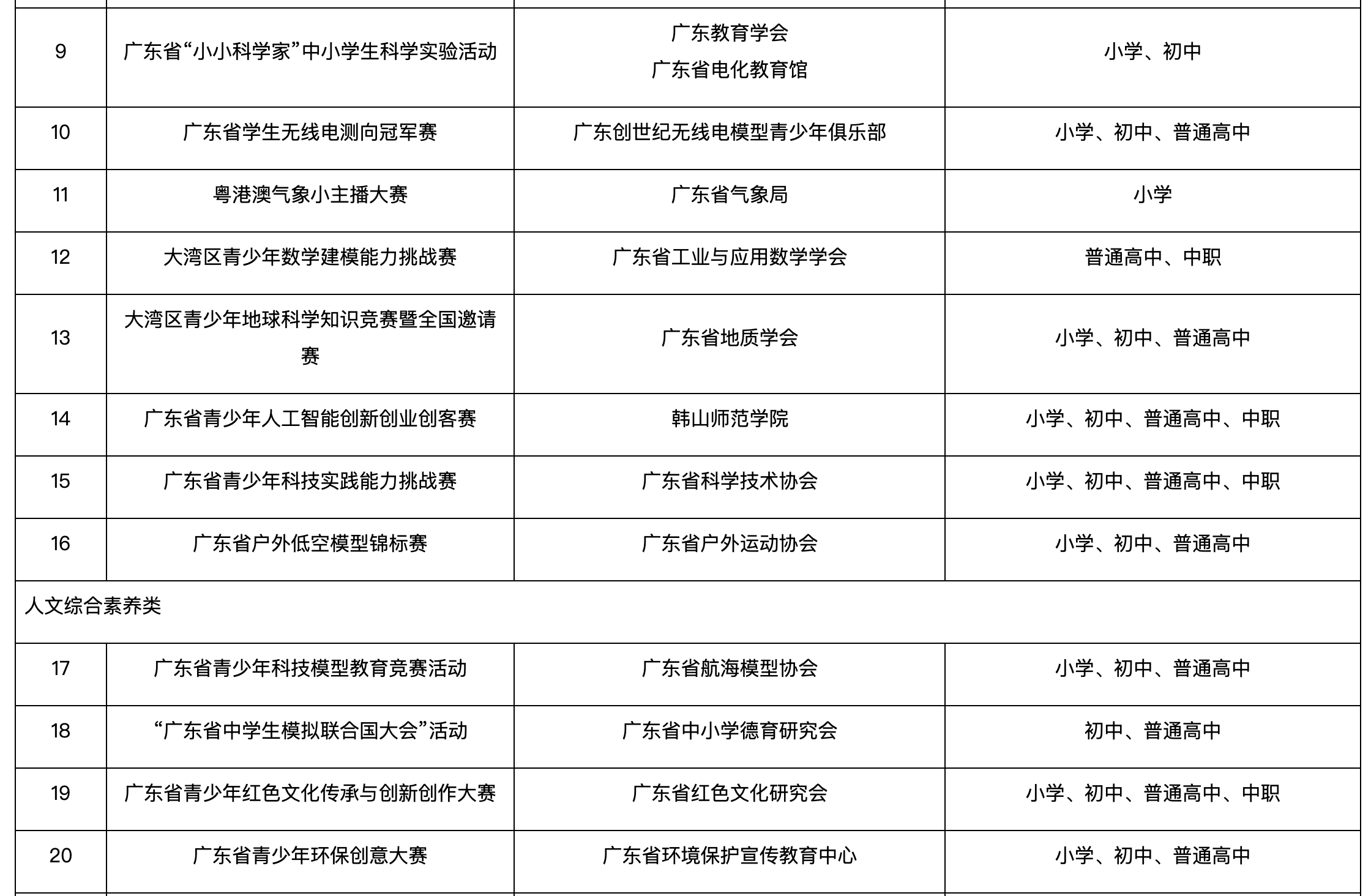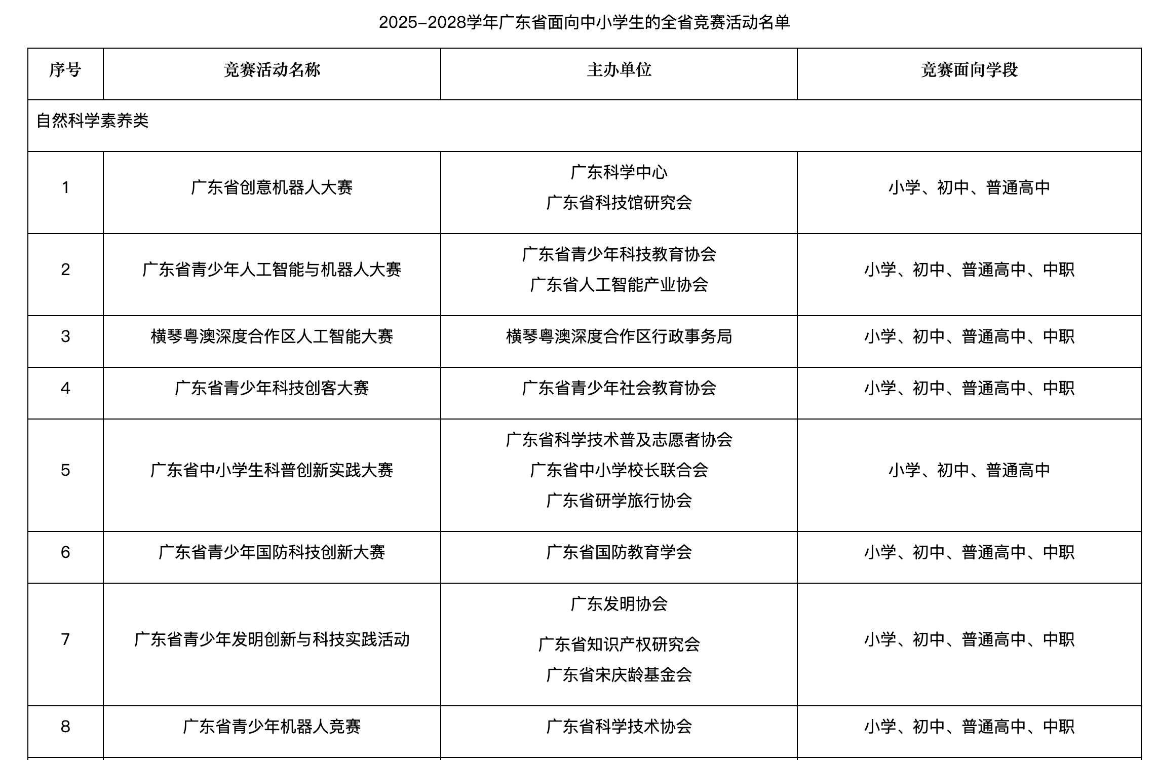 从赛事类别来看,自然科学素养类赛事数量最多,达16项,涵盖机器人、人工智能、科技创客、国防科技、地球科学等多个前沿领域,包含广东省创意机器人大赛、广东省青少年人工智能与机器人大赛、横琴粤澳深度合作区人工智能大赛、广东省青少年科技创客大赛等竞赛。人文综合素养类赛事共11项,兼顾红色文化传承、环保创意、国学风采、心理健康等多元主题,如广东省青少年红色文化传承与创新创作大赛、广东省少儿国学风采大赛等。艺术体育类赛事有4项,包括“星海音乐学院杯”广东省中小学音乐与舞蹈大赛、“粤见花开”广东省青少年美育成果展示大展、“翰墨青春 传承岭南”广东青少年书画大赛等。