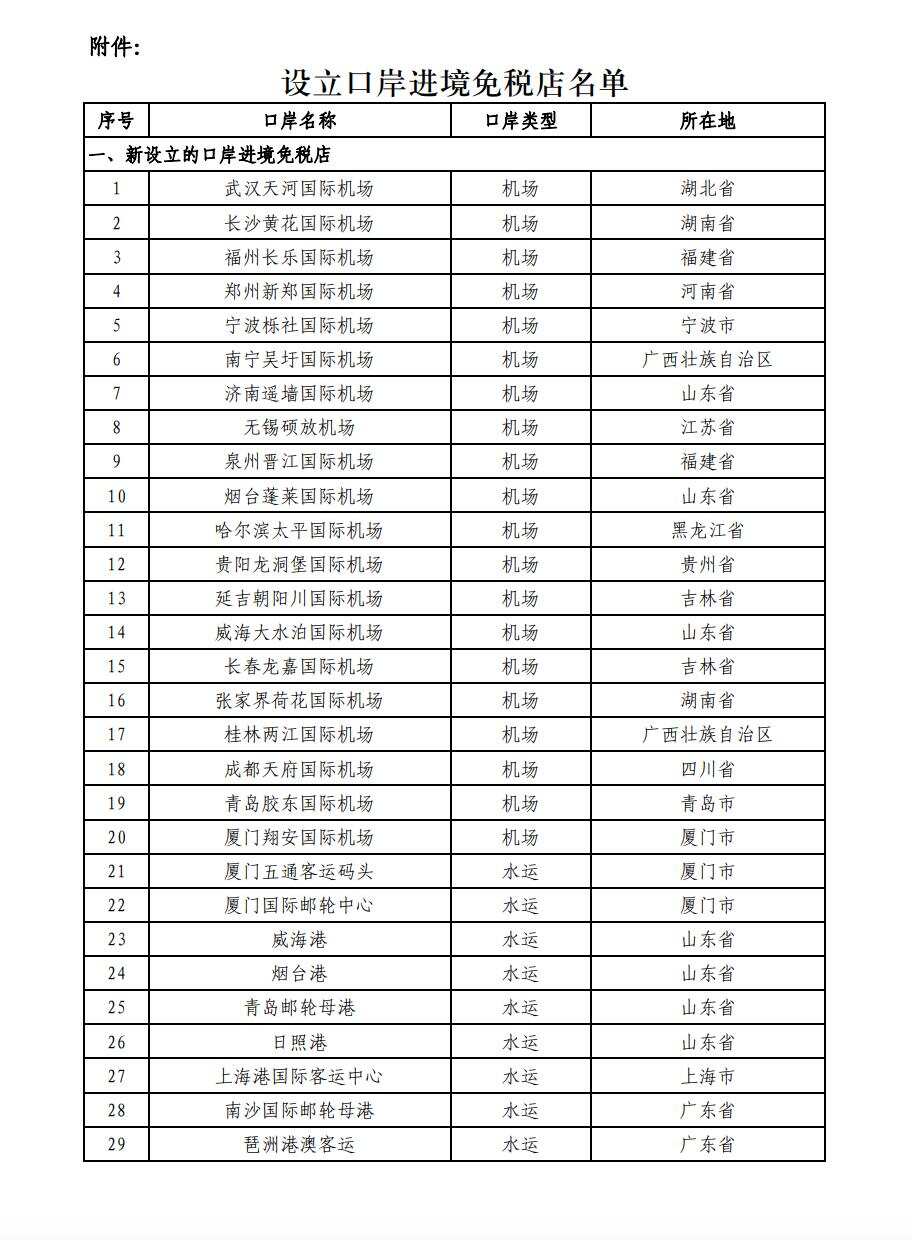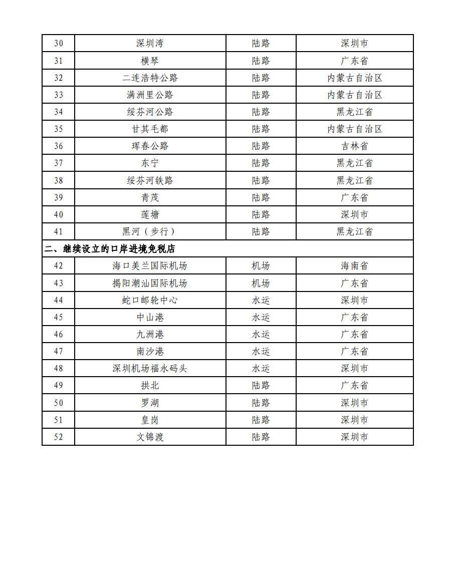 二、继续在海口美兰国际机场、蛇口邮轮中心等11个口岸设立口岸进境免税店(在本通知所附《设立口岸进境免税店名单》中为序号42—52)。