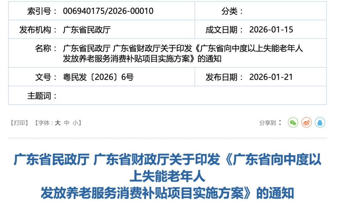 近日,广东省民政厅、广东省财政厅印发《广东省向中度以上失能老年人发放养老服务消费补贴项目实施方案》(以下简称《方案》)。