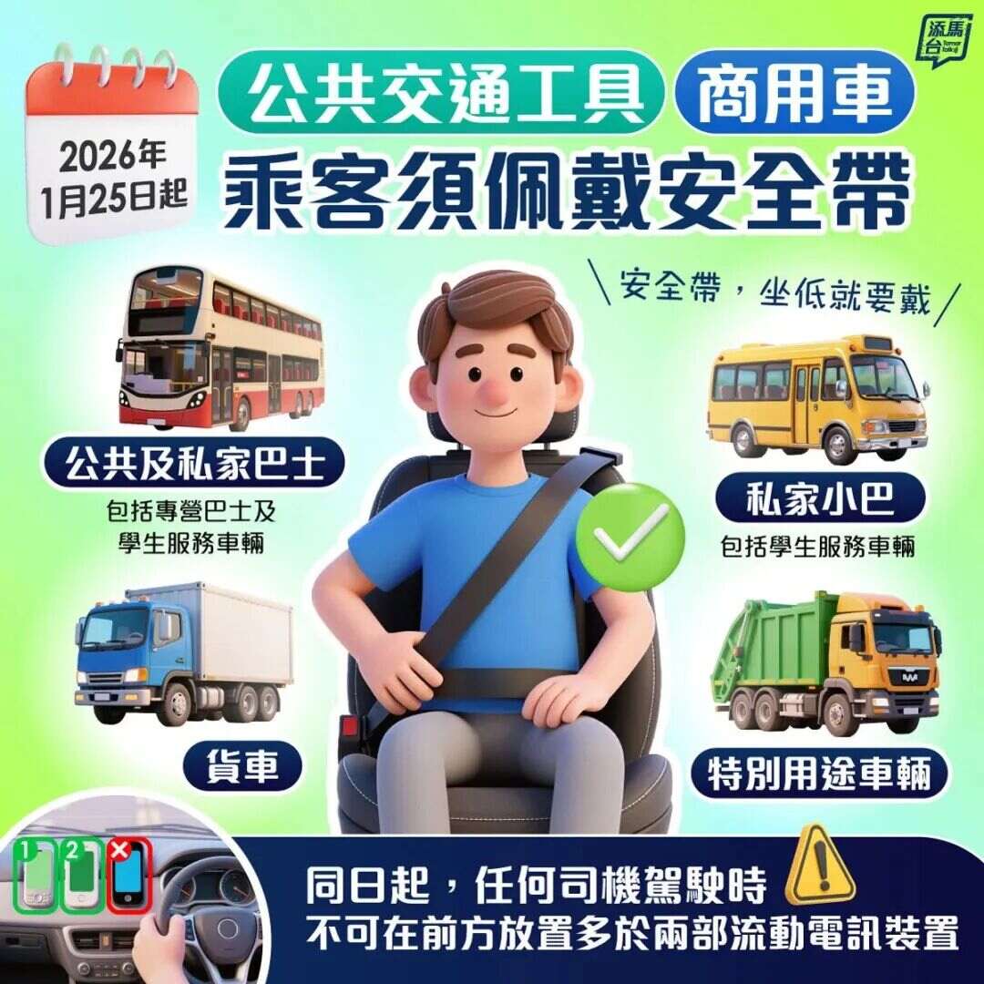 新修订的《道路交通规例》于1月25日生效,乘搭巴士等公共交通工具和商用车时,如座位上装有安全带,乘客必须全程扣上,否则会被检控,最高罚款5000港元及监禁3个月。